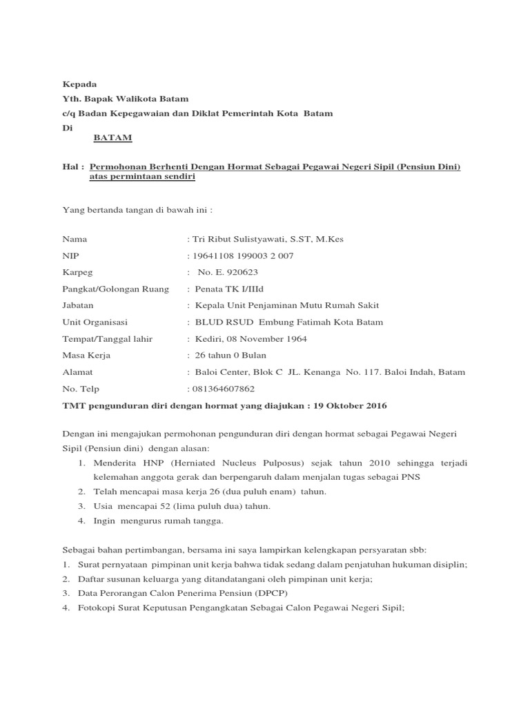Dengan kata lain, pengajuan pensiun dini atas permintaan sendiri tidak bisa dilakukan oleh pns di bawah usia 45 tahun. Jika syarat masa pengabdian dan usia telah anda penuhi, maka anda dapat mengajukan pemberhentian atas permintaan sendiri. 10 contoh surat permohonan dengan penulisan yang baik dan. Maka dari itu, kamu perlu contoh. Dengan h#rmat, yang yang bertandangan di ba$ah ini % &ama.